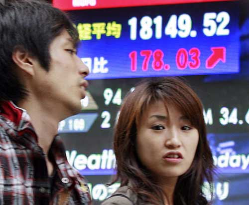 18日,兩名行人從日本首都東京的一個顯示股票信息的電子顯示屏前走過。日本最大的證券交易所東京證券交易所最新公布的股票分布情況調(diào)查結(jié)果表明,截至日本2006財政年度末(2007年3月底),在東京證券交易所等日本國內(nèi)5家證券交易所(二板市場除外)交易的股票總值中,外國股東持有的比例達到28%,創(chuàng)歷史最高紀錄。