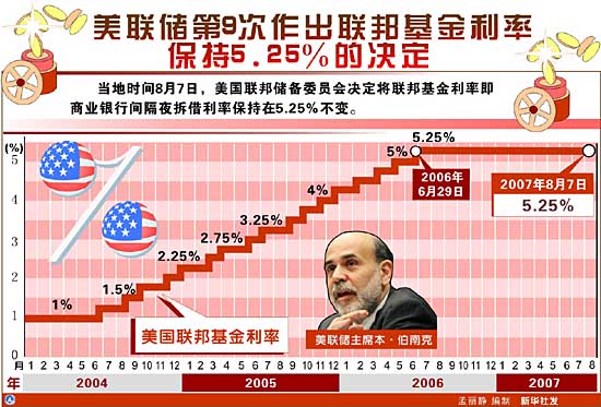 盡管受次級(jí)抵押貸款市場(chǎng)危機(jī)影響,紐約股市最近幾周劇烈震蕩,但美國聯(lián)邦儲(chǔ)備委員會(huì)7日仍決定將聯(lián)邦基金利率即商業(yè)銀行間隔夜拆借利率繼續(xù)維持在5.25%不變。分析人士認(rèn)為,這表明美聯(lián)儲(chǔ)認(rèn)為新形勢(shì)尚不足以改變經(jīng)濟(jì)總體走勢(shì),其對(duì)于未來經(jīng)濟(jì)增長(zhǎng)的信心沒有改變。