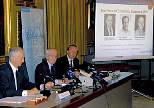 | 瑞典皇家科學院15日宣布,將2007年諾貝爾經濟學獎授予萊昂尼德·赫維奇、埃里克·馬斯金和羅杰·邁爾森(屏幕上由左至右)3名美國經濟學家。新華社記者