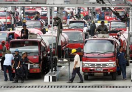 在印度尼西亞首都雅加達(dá),卡車(chē)司機(jī)等待加油。(本報(bào)資料照片) |