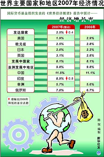當前世界經濟形勢呈現兩大特點:一是總體增長有所放緩,但仍相對強勁;二是各經濟體間分化加劇,發(fā)達經濟體增長乏力,而新興市場經濟體則增長強勁。 在各主要經濟體中,發(fā)達經濟體成為世界經濟保持快速增長的不利因素。IMF的報告認為,美國經濟走勢尤其不容樂觀,其今明兩年經濟增長率均為1.9%,低于去年的2.9%,比原來的預測分別降低0.1和0.9個百分點。考慮到住房市場下滑和次貸危機沖擊,美國聯(lián)邦儲備委員會和白宮不久前也下調了對美國經濟增長的預期,并認為美國住房市場下滑的嚴重程度要高于預期。由于西方金融市場息息相關,美國次貸危機外溢也使得歐盟、日本和加拿大等其他發(fā)達經濟體增長放緩。 與發(fā)達經濟體增長放慢相對照,發(fā)展中國家尤其是新興市場經濟體發(fā)展前景相對樂觀,并未受到次貸危機的太大影響。據IMF預測,亞洲發(fā)展中地區(qū)經濟今明兩年增長率分別達到9.8%和8.8%,其中中國達到11.5%和10.0%,印度則為8.9%和8.4%。而撒哈拉沙漠以南非洲國家的經濟增長目前正處于40多年來最快的階段,該地區(qū)發(fā)展較快的一些國家在減貧方面取得了重大進展。 IMF的報告認為,新興市場經濟體正成為“世界經濟穩(wěn)定的來源”。世界經濟正越來越依賴中國、印度、俄羅斯等新興市場經濟體的表現,過去一年全球經濟增長的50%來自中國、印度和俄羅斯。IMF認為,新興市場經濟體之所以取得如此顯著成就,除了經濟全球化的因素外,新興市場經濟體政府正確的決策是最重要的原因。