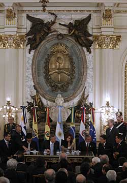 | 9日,厄瓜多爾總統(tǒng)科雷亞、玻利維亞總統(tǒng)莫拉萊斯、阿根廷總統(tǒng)基什內(nèi)爾和當(dāng)選總統(tǒng)克里斯蒂娜·費(fèi)爾南德斯、巴西總統(tǒng)盧拉、巴拉圭總統(tǒng)杜阿爾特、委內(nèi)瑞拉總統(tǒng)查韋斯(從左至右)在阿根廷首都布宜諾斯艾利斯出席南方銀行成立的簽字儀式。新華社發(fā) | 本報(bào)布宜諾斯艾利斯電