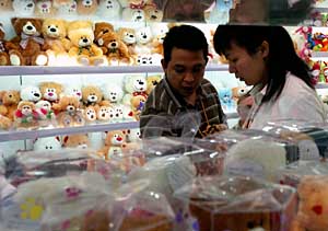 | 圖為一名美國客商在10月份舉行的第102屆中國進(jìn)出口商品交易會(huì)(廣交會(huì))展館中與工作人員商談玩具出口事宜。本報(bào)資料照片 | 關(guān)鍵詞一:貿(mào)易平衡發(fā)展
