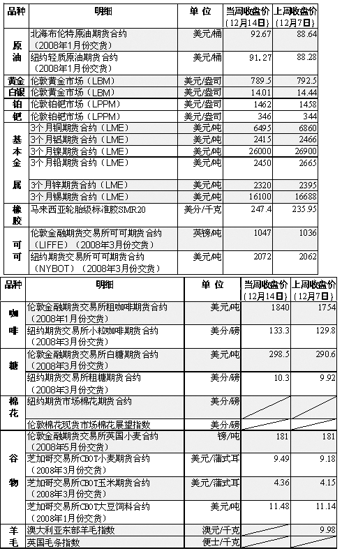 美國農(nóng)業(yè)部11日的報告稱,到本銷售年度結(jié)束時(明年5月31日),美國小麥庫存將僅為2.8億蒲式耳(762萬噸),為60年來最低。同為小麥出口大國的阿根廷和澳大利亞由于受到干旱天氣的影響,小麥產(chǎn)量和出口量也明顯減少。另一方面,消費國則不斷向國際市場尋求購買小麥。 受美聯(lián)儲降息和美國原油庫存下降等因素影響,國際油價強勁反彈,之后由于美元走強以及投資者擔心原油需求將減少,紐約市場油價連續(xù)兩天走低,但仍收于每桶90美元上方。 美聯(lián)儲11日宣布,將聯(lián)邦基金利率下調(diào)0.25個百分點至4.25%,當日國際油價重回每桶90美元上方。市場人士認為,降息可以阻止美國經(jīng)濟陷入衰退并增加能源需求,同時可以使以美元計價的原油以及原油產(chǎn)品對持有其他貨幣的購買者更具吸引力。 受美元升值因素影響,黃金和白銀期貨價格均小幅回落,其中倫敦市場黃金期貨價格當周收于每盎司789.5美元。數(shù)據(jù)顯示,美元對其他幾種主要貨幣的匯率14日升至7周以來最高點。市場人士認為,美元升值使以美元計價的大宗商品對其他貨幣的持有者顯得“更加昂貴”。 由于市場對美國經(jīng)濟放緩的擔憂仍未消除,基本金屬價格繼續(xù)走低,倫敦市場銅期貨價已跌至每噸6495美元。 遭遇暴雨襲擊后,橡膠主產(chǎn)地——馬來西亞和泰國南部地區(qū)洪水泛濫,橡膠價格因供給趨緊而攀升。受主要出口國科特迪瓦爆發(fā)的大罷工影響,可可價格也反彈至7月來最高點。