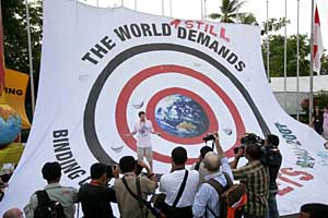 | 15日,在印度尼西亞巴厘島國(guó)際會(huì)議中心外,環(huán)保人士豎起一面面積達(dá)144平方米的標(biāo)靶圖案條幅,呼吁人們?cè)?007年聯(lián)合國(guó)氣候變化大會(huì)結(jié)束之后繼續(xù)關(guān)注氣候變化問(wèn)題。當(dāng)天,在這里舉行的聯(lián)合國(guó)氣候變化大會(huì)通過(guò)了“巴厘島路線(xiàn)圖”。新華社記者