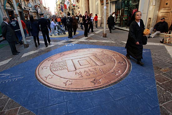 在馬耳他首都瓦萊塔的共和國(guó)大街,大幅馬耳他歐元硬幣的圖案覆蓋在路面上。塞浦路斯和馬耳他將從2008年1月1日開始使用歐元。屆時(shí),歐元區(qū)將由目前的13國(guó)擴(kuò)大為15國(guó)。