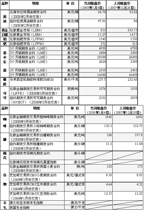 受非洲主要產(chǎn)油國尼日利亞國內(nèi)局勢持續(xù)動(dòng)蕩、投資者擔(dān)心原油供應(yīng)緊張以及美元貶值等因素影響,國際油價(jià)在2008年的第一個(gè)交易日(2008年1月2日)即大幅上漲,當(dāng)日紐約市場2月份交貨的輕質(zhì)原油期貨價(jià)格不僅歷史上首度突破每桶100美元大關(guān),而且創(chuàng)下每桶99.62美元的歷史最高收盤紀(jì)錄。 截至2007年12月28日的一周里,美國原油商業(yè)庫存比前一周下降400萬桶,降幅大于分析人士預(yù)期的170萬桶。受此消息影響,紐約市場經(jīng)過反復(fù)震蕩后開始沖高,3日盤中一度達(dá)到每桶100.09美元的歷史最高價(jià)。但隨后受交易者獲利回吐影響,當(dāng)日收盤時(shí)該種原油期貨價(jià)格報(bào)收于每桶99.18美元,比前一個(gè)交易日下跌44美分。 美國勞工部1月4日公布的報(bào)告顯示,2007年12月份美國失業(yè)率上升到5%,高于前一個(gè)月的4.7%,為2005年11月份以來的最高水平。由于投資者擔(dān)心就業(yè)市場不景氣將影響美國消費(fèi)增長,進(jìn)而影響用油需求,4日國際油價(jià)繼續(xù)下滑。 歐佩克新任輪值主席、阿爾及利亞能源和礦業(yè)部長沙基卜·哈利勒1月5日表示,油價(jià)上升勢頭“很可能要持續(xù)到第一季度末”,預(yù)計(jì)到第二季度有望“穩(wěn)定”下來。 在美元疲軟、油價(jià)不斷突破紀(jì)錄的背景下,當(dāng)周其他大宗商品的期貨價(jià)格均有不同程度的上揚(yáng)。1月3日,紐約商品交易所2月份交貨的黃金期貨合約價(jià)一度摸高至每盎司872.9美元,與28年前創(chuàng)下的每盎司873美元?dú)v史最高紀(jì)錄僅“毫厘之差”。倫敦市場的黃金期貨價(jià)格1月3日升至每盎司868.89美元的歷史高位,鉑的期貨價(jià)格創(chuàng)下每盎司1554美元的歷史新高。 亞洲最近處于季風(fēng)季節(jié),潮濕的天氣影響了供給,橡膠價(jià)格因而走高。