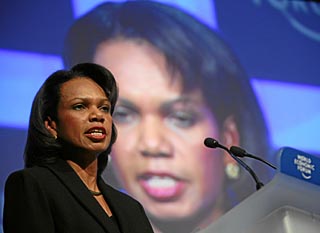 23日,美國國務(wù)卿賴斯在瑞士達(dá)沃斯舉行的世界經(jīng)濟(jì)論壇年會(huì)上講話。當(dāng)日,27位國家元首或政府首腦,110多位政府部長以及眾多知名企業(yè)領(lǐng)導(dǎo)人和政界人士聚首瑞士達(dá)沃斯,參加一年一度的世界經(jīng)濟(jì)論壇年會(huì)。新華社發(fā)