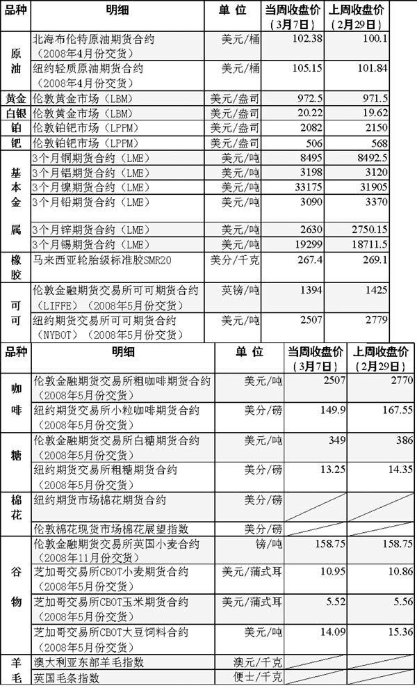 當(dāng)周,國際油價延續(xù)了上周的升勢,交易首日就在真正意義上“創(chuàng)了新高”,之后依舊保持升勢,并頻頻刷新紀(jì)錄。當(dāng)周最后一個交易日,紐約商品交易所輕質(zhì)原油期貨價格更是創(chuàng)下每桶106.54美元的歷史最高盤中價。 美元匯率頻創(chuàng)新低是導(dǎo)致當(dāng)周油價屢攀新高的主要原因。除4日外,當(dāng)周其他4個交易日紐約匯市歐元對美元匯率均不斷創(chuàng)新高,美元走軟增加了以美元計價的原油期貨作為投資商品的吸引力。此外,美國原油商業(yè)庫存意外下降以及石油輸出國組織(歐佩克)決定暫時維持產(chǎn)量不變等因素也對油價上漲起到了一定的助推作用。 不過,許多分析人士認(rèn)為,目前油價飆升趨勢是暫時的。從供應(yīng)方面看,盡管前一周美國原油商業(yè)庫存下降,但其總體水平仍處于歷史高點。與之形成對比的是,需求方面則持續(xù)低迷。數(shù)據(jù)顯示,過去4周里,市場對原油及其產(chǎn)品的整體需求比上年同期下降了3.4%。 受美元持續(xù)疲軟的影響,貴金屬價格紛紛上揚。倫敦市場黃金期貨價格在6日升至每盎司992.50美元的歷史新高,鉑期價漲至每盎司2301.50美元的歷史最高點,銀期價則攀至27年來的新高——每盎司21.22美元。 據(jù)倫敦金屬交易所跟蹤調(diào)查,銅庫存目前處于自去年10月份以來的最低水平,加上需求強勁、美元疲軟以及投資基金涌入市場等因素影響,倫敦市場3個月銅期貨合約價格一度躍至每噸8820美元的歷史最高位;錫期價則在4日漲至每噸19375美元,創(chuàng)下自1989年以來的最高紀(jì)錄。 油價上漲推動用于生產(chǎn)乙醇燃料的玉米價格跟著走高,芝加哥玉米期貨價格5日盤中創(chuàng)下每蒲式耳5.74美元的歷史新高。此外,大豆期價3日創(chuàng)下每噸15.8625美元的歷史紀(jì)錄,但之后多頭獲利盤大面積出逃使大豆價格慘跌。