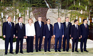 7日,在日本北海道洞爺湖,參加八國(guó)集團(tuán)首腦會(huì)議的領(lǐng)導(dǎo)人在竹子裝飾前合影,從左至右依次為意大利總理貝盧斯科尼、俄羅斯總統(tǒng)梅德韋杰夫、德國(guó)總理默克爾、英國(guó)首相布朗、日本首相福田康夫、美國(guó)總統(tǒng)布什、加拿大總理哈珀、法國(guó)總統(tǒng)薩科齊和歐盟委員會(huì)主席巴羅佐。新華社發(fā)