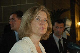 | 29日,印度商業(yè)和工業(yè)部長納特(上)、美國貿(mào)易代表施瓦布(下)在日內(nèi)瓦接受記者采訪。新華社記者 尚軍