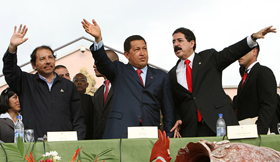 25日,在洪都拉斯首都特古西加爾巴自由廣場,洪都拉斯總統(tǒng)塞拉亞(右)、委內瑞拉總統(tǒng)查韋斯(中)和尼加拉瓜總統(tǒng)奧爾特向人群揮手致意。洪都拉斯總統(tǒng)塞拉亞當日簽署決議書,宣布洪都拉斯正式加入“美洲玻利瓦爾替代計劃”。