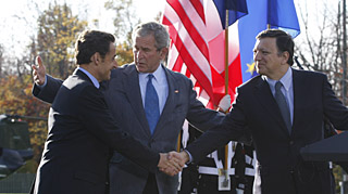 | 圖為18日,在美國馬里蘭州戴維營,美國總統(tǒng)布什(中)歡迎到訪的法國總統(tǒng)薩科齊(左)和歐盟委員會主席巴羅佐。布什當(dāng)天宣布,美國將于近期就國際金融危機(jī)問題主持召開一次國際峰會。新華社/法新 | 在法國總統(tǒng)尼古拉·薩科齊等歐洲領(lǐng)導(dǎo)人積極游說下,美國總統(tǒng)喬治·W·布什18日宣布將出面召集各國領(lǐng)導(dǎo)人,舉行全球峰會應(yīng)對金融危機(jī)。 聯(lián)合國秘書長潘基文說,希望擬議中的全球金融峰會在紐約聯(lián)合國總部舉行,以體現(xiàn)全球齊心抵御金融危機(jī)的集體意志和多邊主義色彩。 薩科齊和歐洲聯(lián)盟委員會主席若澤·曼努埃爾·巴羅佐18日前往位于馬里蘭州的美國總統(tǒng)度假地戴維營,與布什總統(tǒng)舉行大約3小時會談。 薩科齊和巴羅佐此行目的之一是說服布什出面召集一個全球峰會,以加強(qiáng)各國在眼下全球金融危機(jī)中的合作和互助,避免全球金融市場繼續(xù)動蕩。 路透社之前援引美國一名政府高官的話報道說,布什將在與薩科齊等人會談后宣布將主持全球金融峰會。 不過,布什在會談開始前即宣布愿意出面召集金融峰會。 “有必要攜手工作,因為我們共處這場危機(jī)中,”布什說,“我期待在不久的將來主持這個峰會!彼麤]有提及峰會具體日程。 薩科齊是全球峰會的積極倡議者。 金融危機(jī)愈演愈烈之際,他呼吁八國集團(tuán)領(lǐng)導(dǎo)人和其他新興經(jīng)濟(jì)體領(lǐng)導(dǎo)人在今年年底前舉行全球峰會,聯(lián)手應(yīng)對危機(jī),探討建立國際金融新秩序。這一呼吁得到英國首相戈登·布朗、德國總理安格拉·默克爾的響應(yīng)。 薩科齊17日重申重建國際金融體系的重要性。他在加拿大魁北克市出席第12屆法語國家首腦會議時說:“我們需要攜手重建資本主義,更加以人為本,更加尊重地球,更加尊重年輕一代! 他說,瘋狂尋求短期利潤的現(xiàn)有資本主義模式應(yīng)該“終結(jié)”。 薩科齊當(dāng)天在戴維營再次批判釀成眼下危機(jī)的資本主義模式,稱“這類資本主義是對我們信仰的資本主義的背叛”! 布什似乎對薩科齊借峰會“修正”資本主義的傾向有所警惕。他強(qiáng)調(diào),峰會不應(yīng)尋求削弱全球自由市場的基本經(jīng)濟(jì)原則,“我們必須抗拒經(jīng)濟(jì)孤立的危險誘惑,繼續(xù)市場開放政策”。 聯(lián)合國秘書長潘基文18日致信薩科齊,稱聯(lián)合國方面全力支持今年12月初召集全球金融峰會的設(shè)想,愿意提供聯(lián)合國總部為峰會會場。 “我們一致同意,現(xiàn)在時間緊迫,我完全認(rèn)同您關(guān)于12月初盡早召集這么一個論壇的主張,”潘基文在魁北克會晤薩科齊后發(fā)表一封公開信說,“在這個問題上,我非常愿意提供位于紐約的聯(lián)合國辦公大樓! 潘基文說,把峰會會場放在聯(lián)合國總部有特殊意義,因為聯(lián)合國是“多邊主義”的象征,“將給這次努力帶來廣泛合法性,同時彰顯愿意面對這場全球性嚴(yán)重挑戰(zhàn)的集體意志”。 白宮一名發(fā)言人18日說,布什與薩科齊等人的戴維營會談不會設(shè)定全球峰會的時間和地點,也不會宣布新的政策。 (新華社專稿) |