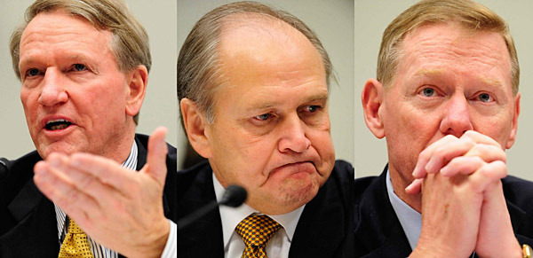 | 這張拼接的照片顯示,11月19日,在美國華盛頓國會山,美國通用汽車公司首席執(zhí)行官瓦格納(左一)、克萊斯勒汽車公司首席執(zhí)行官納爾代利和福特汽車公司首席執(zhí)行官穆拉利(右一)出席眾議院就美國汽車工業(yè)救援方案舉行的聽證會。新華社記者