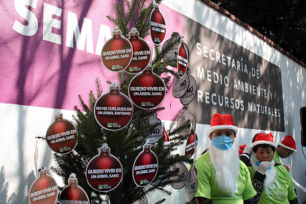 15日,在墨西哥城的環(huán)境和自然資源部前,近30名墨西哥綠色生態(tài)黨成員裝扮成圣誕老人參加集會,要求政府促進銷售本國的圣誕樹,而不是賣其他國家的圣誕樹。