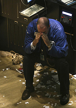 | 一名交易員在股市收盤后坐在美國紐約證券交易所交易大廳里。新華社/路透 | 2008年,美國經(jīng)歷了百年一遇的金融危機,紐約股市遭遇歷史性打擊。受其拖累,日本股市也在風暴中走完2008年。 2008年紐約股市三大指數(shù)呈現(xiàn)逐級下挫走勢。年初以來,道瓊斯指數(shù)從13000點之上跌落,截至12月12日,該指數(shù)下挫了35%。代表性更廣的標準普爾500指數(shù)全年下挫40%。納斯達克指數(shù)跌幅更深,達到42%。如今,三大指數(shù)都已跌回到了10年前的水平。 隨著金融危機蔓延到實體經(jīng)濟,能源、基礎設施、交通運輸、制造業(yè)、零售業(yè)等各類企業(yè)都遭到不同程度的沖擊,公司盈利下滑以及虧損的消息不斷傳來。由于股票遭到投資者拋售,很多公司的股價已經(jīng)跌至1美元之下。進入9月以來,在紐約證交所每周都有幾家公司的股票被警告或被列入摘牌的名單。 市場暴跌還導致紐約股市一度喪失融資功能。從9月金融危機爆發(fā)以來,沒有一家公司在紐約市場融資上市,這創(chuàng)出上個世紀70年代以來最長的一段“枯水期”。今年全年,當年上市美國企業(yè)只有43家,融資總額為
