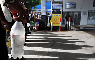 | 在斯里蘭卡首都科倫坡,人們手持各種容器在加油站排隊(duì)買汽油。新華社發(fā) |