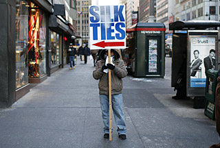 | 23日,一名男子在美國紐約市的街頭手持銷售領帶的標牌。美國市場調查公司ShopperTrak RCT公司24日發(fā)表統(tǒng)計數據顯示,美國零售商店今年圣誕節(jié)前周末客流量較去年同期下滑24%,今年年底可能是40年來最暗淡的一個銷售季。新華社/路透 | 24日平安夜,各處商家店鋪提早關門,今年的圣誕節(jié)購物季也宣告結束。在金融危機的沖擊下,美國人的圣誕消費悄然發(fā)生變化——紛紛過起了“緊日子”,更加精打細算,盡量減少購物預算。零售商的日子不太好過。不過有分析家預測今年的節(jié)后銷售要熱過往年。