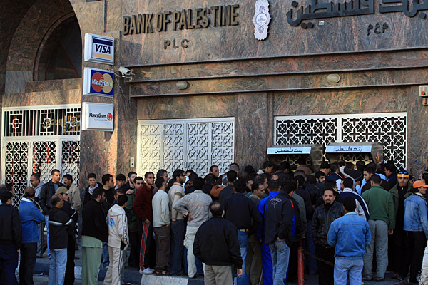 13日,巴勒斯坦人在加沙城內(nèi)的一家巴勒斯坦銀行排隊(duì)取款。這是這家銀行自去年12月27日以色列采取軍事行動(dòng)以來首次營(yíng)業(yè)。