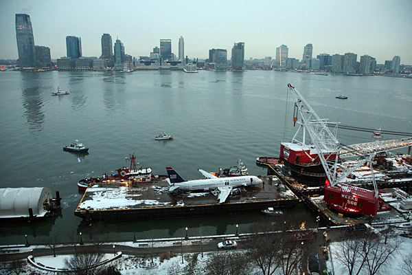 18日,在美國紐約,被打撈出哈得孫河的全美航空公司1549號航班客機在岸邊等待運輸,它將被運往新澤西州進行進一步的檢查。該客機15日下午因飛鳥撞擊導致引擎故障,墜入紐約哈得孫河。因機長沉著應對和紐約應急救援部門的快速反應,150名乘客以及5名機組人員全部獲救。新華社/路透