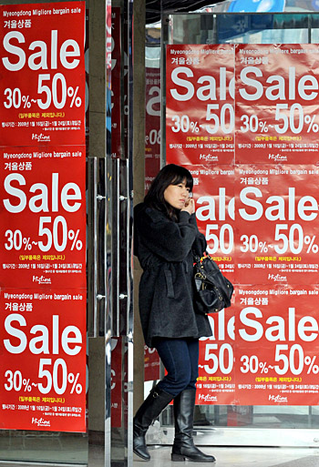 1月22日,在韓國首都首爾,一名行人經(jīng)過貼滿打折廣告的商場大門。韓國中央銀行韓國銀行22日發(fā)布報告說,由于國際需求持續(xù)下降導致制造業(yè)和出口惡化,去年第四季度韓國國內(nèi)生產(chǎn)總值(GDP)比前一季度大幅縮水5.6%。新華社/法新