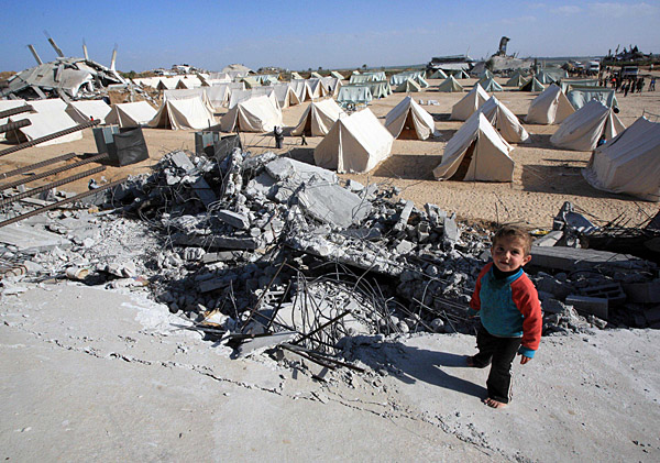 1月31日,在加沙地帶北部的賈巴利亞,一名兒童站在一個(gè)由帳篷組成的臨時(shí)居民點(diǎn)外。以軍持續(xù)22天的“鑄鉛行動(dòng)”導(dǎo)致加沙地帶大量建筑被損毀,而;鹬笠陨袑(duì)加沙的持續(xù)封鎖以及巴勒斯坦內(nèi)部對(duì)接受國(guó)際援助問題的分歧使得加沙重建工作進(jìn)展緩慢。