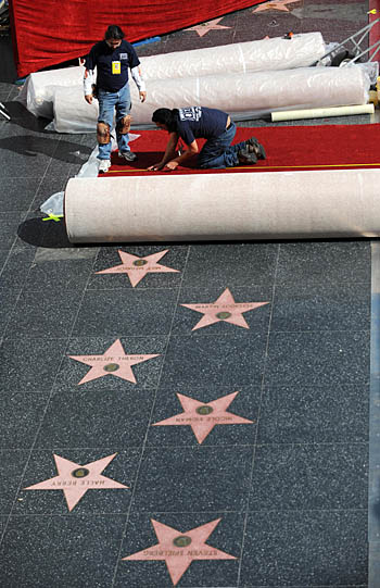 18日,工人們在美國加利福尼亞好萊塢柯達劇院前鋪設(shè)紅地毯。第81屆奧斯卡獎頒獎典禮將于22日在柯達劇院舉行。新華社/法新