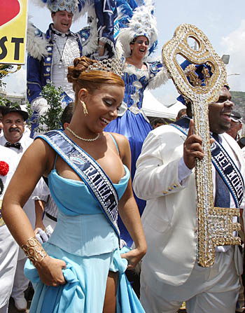 20日,在巴西里約熱內(nèi)盧狂歡節(jié)開幕式上,被稱作“莫莫王”的“狂歡節(jié)國(guó)王”(前右)手持象征城市統(tǒng)治權(quán)的城門鑰匙與狂歡節(jié)皇后(前左)一起跳桑巴舞。當(dāng)天,巴西里約熱內(nèi)盧一年一度的盛大狂歡節(jié)拉開帷幕。里約熱內(nèi)盧狂歡節(jié)有“地球上最大聚會(huì)”之稱,每年吸引大量國(guó)外游客。新華社/法新