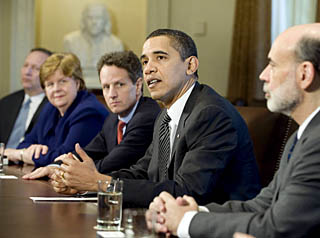 | 23日,在美國(guó)華盛頓白宮,美國(guó)總統(tǒng)奧巴馬(右二)會(huì)見經(jīng)濟(jì)顧問。奧巴馬在會(huì)見后表示,他堅(jiān)信財(cái)政部長(zhǎng)蓋特納當(dāng)天宣布的剝離銀行不良資產(chǎn)以促使信貸恢復(fù)流動(dòng)的計(jì)劃將產(chǎn)生良好效果。新華社/路透 | 美國(guó)財(cái)政部長(zhǎng)蓋特納23日宣布了一項(xiàng)幫助銀行剝離不良資產(chǎn)(俗稱“有毒資產(chǎn)”)的計(jì)劃。這是奧巴馬政府為恢復(fù)信貸流動(dòng)而采取的一系列措施中的最新步驟。對(duì)于當(dāng)天出臺(tái)的這份計(jì)劃,市場(chǎng)反響積極,美國(guó)股市暴漲。 美國(guó)總統(tǒng)奧巴馬當(dāng)天表示,剝離銀行不良資產(chǎn)是促使信貸恢復(fù)流動(dòng)方面絕對(duì)重要的又一個(gè)環(huán)節(jié)。他說,效果不會(huì)在一夜之間顯現(xiàn),金融系統(tǒng)中仍存在很大的脆弱性,但方向是正確的。他堅(jiān)信這份計(jì)劃將產(chǎn)生積極的效果。 他說,政府與美聯(lián)儲(chǔ)、聯(lián)邦儲(chǔ)蓄保險(xiǎn)公司以及其他相關(guān)機(jī)構(gòu)協(xié)調(diào)行動(dòng),不僅能促使信貸市場(chǎng)開始解凍,而且能為改革監(jiān)管制度以避免類似系統(tǒng)性危機(jī)再次發(fā)生提供條件。 但有分析人士認(rèn)為,由于存在諸多不利因素,這一計(jì)劃的實(shí)際效果還有待觀察。