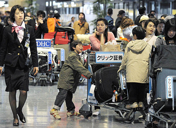 24日,在日本成田機場,旅客們等待登機。當日,受3月23日早晨發(fā)生的貨機墜機事故影響的A跑道已清理完畢,重新開放。新華社/法新
