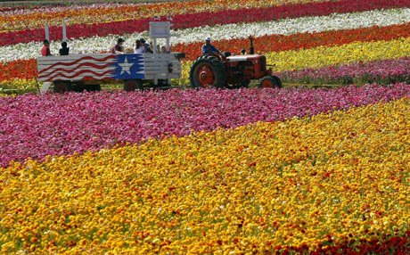 7日,在美國加利福尼亞州卡爾斯巴德一個花卉種植園,游客乘著拖拉機賞花。 新華社/路透