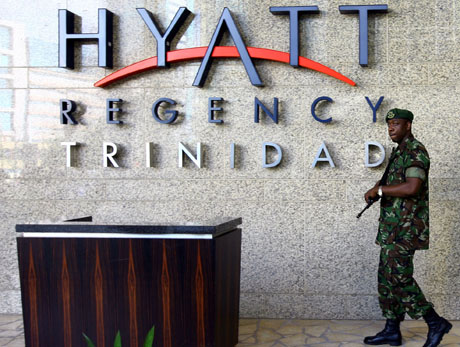 15日,在特立尼達(dá)和多巴哥首都西班牙港,安保人員在會場周圍巡邏。來自美洲國家組織的34個成員國首腦或代表將于17日至19日在西班牙港舉行第五屆美洲國家首腦會議。新華社發(fā)