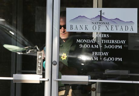 2008年7月25日,美國內(nèi)華達(dá)州第一國民銀行破產(chǎn)停業(yè),一名調(diào)查人員鎖上大門。新華社/美聯(lián) |