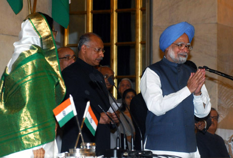 22日,在印度首都新德里,連任的印度總理曼莫漢·辛格(右一)宣誓就職。當(dāng)日,以曼莫漢·辛格總理為首的新一屆印度政府在印度總統(tǒng)府正式宣誓就職。新華社發(fā) | 以總理辛格為首的印度新政府22日宣誓就職后,其內(nèi)外政策走向成為印度國內(nèi)外輿論關(guān)注的焦點(diǎn)。當(dāng)?shù)孛襟w普遍認(rèn)為,繼續(xù)拉動本國經(jīng)濟(jì)發(fā)展將是印度新政府各項(xiàng)工作的重中之重。 在印度新一屆政府中,前外交部長慕克吉出任財政部長,印度“硅谷”班加羅爾建造者之一、來自南方的前卡納塔克邦首席部長克里希納出任外交部長。慕克吉23日對媒體表示,保護(hù)印度經(jīng)濟(jì)免受國際經(jīng)濟(jì)衰退帶來的沖擊是新一屆政府的首要任務(wù),同時新政府將采取措施激活本國經(jīng)濟(jì),保持經(jīng)濟(jì)增長?死锵<{在會見記者時表示,印度外交是為經(jīng)濟(jì)發(fā)展服務(wù)的,印度政府的目標(biāo)是在今后相當(dāng)長的時間內(nèi)保持經(jīng)濟(jì)增長,做到這一點(diǎn)需要和平安寧的周邊環(huán)境和有利的國際環(huán)境。