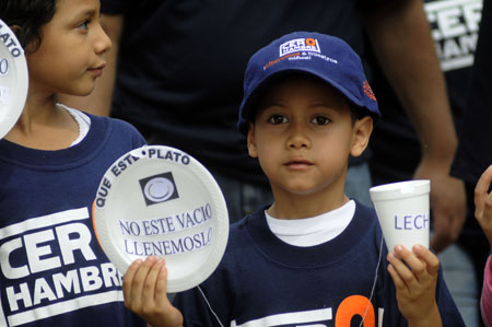 6月7日,在洪都拉斯首都特古西加爾巴,人們參加“零饑餓”大游行。當(dāng)天,特古西加爾巴市市民以“零饑餓”為主題進行大規(guī)模游行,呼吁社會為消除饑餓和營養(yǎng)不良做出貢獻。據(jù)悉,由于國內(nèi)糧食產(chǎn)量的持續(xù)下滑和中美洲糧食緊缺局面的加劇,目前洪都拉斯國內(nèi)34座城市出現(xiàn)糧食供應(yīng)問題,約有30萬名年齡在5歲以下的兒童營養(yǎng)不良,其中20萬營養(yǎng)不良兒童集中在相對貧瘠的洪都拉南部。目前,洪都拉斯政府正在尋求聯(lián)合國和中美洲鄰國的幫助,以求緩解國內(nèi)日益嚴(yán)重的糧食危機。 |