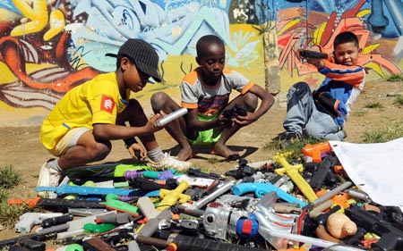 8日,在哥倫比亞麥德林,幾名小男孩擺弄將被銷毀的玩具槍。當(dāng)日,麥德林舉行“兒童裁軍周”活動,孩子們上交手中的玩具槍后可以換回一個家庭購物袋,組織者希望以此引導(dǎo)孩子遠(yuǎn)離暴力游戲。
