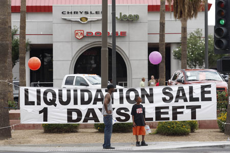 9日,美國亞利桑那州菲尼克斯市的一家克萊斯勒經(jīng)銷商辦事處外打出“清算銷售僅剩一天”的橫幅。新華社/路透 |