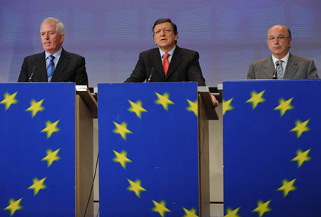 5月27日,歐盟委員會(huì)主席巴羅佐(中)、歐盟委員會(huì)負(fù)責(zé)經(jīng)濟(jì)和貨幣事務(wù)的委員阿爾穆尼亞(右)和負(fù)責(zé)內(nèi)部市場(chǎng)和服務(wù)業(yè)的委員麥克里維在比利時(shí)首都布魯塞爾的歐盟總部出席新聞發(fā)布會(huì),公布?xì)W盟金融監(jiān)管的改革方案。當(dāng)天,歐盟委員會(huì)出臺(tái)改革方案,試圖設(shè)立一套泛歐金融監(jiān)管體系,加強(qiáng)歐盟層面上的金融監(jiān)管,改變目前各成員國(guó)條塊分割的局面。新華社記者:武巍 攝 |