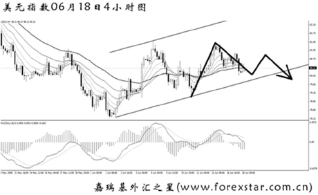 受上述因素影響,美元指數(shù)繼續(xù)維持在震蕩通道內(nèi)徘徊。從4小時圖上看,這次盤整整體為前方下跌的次要節(jié)奏,后市美元指數(shù)下行挑戰(zhàn)6月初低點78.30的概率較大。首先需關注通道下沿79.80的支撐作用,跌破后方可延續(xù)中線的跌勢。預計下周美元指數(shù)將以反彈后再度下挫的走勢為主。