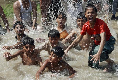 6月28日,在巴基斯坦拉合爾,孩子們?cè)诤永飸蛩{涼。據(jù)路透社報(bào)道,當(dāng)日拉合爾氣溫高達(dá)39攝氏度。