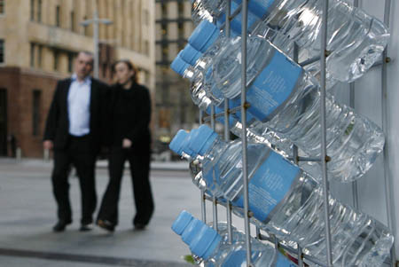 7月9日,2名市民走過澳大利亞悉尼一處賣瓶裝水的商鋪。針對使用瓶裝水對環(huán)境帶來的影響,澳大利亞新南威爾士州小鎮(zhèn)班達(dá)農(nóng)頒布全球首例禁止使用瓶裝水的法令。環(huán)保人士說,生產(chǎn)瓶裝水需使用大量塑料,而且在運送過程中會消耗大量能源。