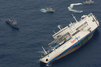 這張菲律賓海軍提供的圖片顯示,9月6日,在菲律賓南部的三寶顏半島附近海域,“超級客輪9”號發(fā)生傾覆,船上乘客在左舷避難。菲律賓海難救援官員6日說,一艘載有近千名乘客的客輪當天凌晨在南部三寶顏半島附近海域傾覆,目前已確認有3人遇難,88人失蹤。