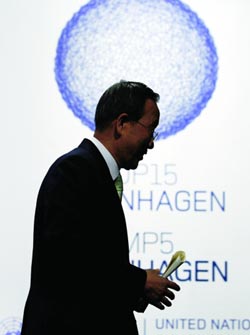 聯(lián)合國秘書長潘基文19日說,在哥本哈根舉行的聯(lián)合國氣候變化大會朝著正確的方向邁出了一步。新華社記者 曾毅 攝