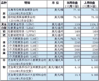 2009年最后一周,國(guó)際大宗商品價(jià)格多數(shù)上漲。 由于寒冷天氣拉動(dòng)燃油消費(fèi),加之美國(guó)原油庫(kù)存已連續(xù)四周下降,餾分油庫(kù)存連續(xù)三周下降,推動(dòng)當(dāng)周原油價(jià)格連續(xù)四個(gè)交易日上漲。此外,受美國(guó)首次申請(qǐng)失業(yè)救濟(jì)人數(shù)下滑等因素影響,紐約市場(chǎng)油價(jià)一度漲至每桶80美元。與2008年年終收盤(pán)相比,國(guó)際油價(jià)2009年的漲幅超過(guò)70%,為過(guò)去10年中漲幅最大的一年。世界經(jīng)濟(jì)復(fù)蘇狀況及國(guó)際貨幣匯率的變化是引發(fā)油價(jià)波動(dòng)的主要因素。 市場(chǎng)預(yù)期,隨著世界經(jīng)濟(jì)進(jìn)一步回升,能源市場(chǎng)的供求狀況將隨之改變,國(guó)際油價(jià)也將在2010年繼續(xù)走強(qiáng)。 當(dāng)周國(guó)際金價(jià)震蕩收平,受美元指數(shù)波動(dòng)影響,四個(gè)交易日里漲跌各半,收盤(pán)價(jià)仍維持在每盎司1100美元附近。 受智利銅礦工人罷工事件影響,倫敦金屬交易所(LME)3個(gè)月期銅價(jià)格在2009年最后一周升至15個(gè)月來(lái)高點(diǎn)。全球基本金屬價(jià)格2009年普遍上漲,其中銅價(jià)漲勢(shì)最為迅猛。LME期銅價(jià)格從2008年12月的每噸2825美元一路飆升至2009年年底的每噸7400美元上方,全年漲幅超過(guò)160%。 由于LME超過(guò)46萬(wàn)噸的鋁庫(kù)存仍處于歷史高位,對(duì)鋁價(jià)起到抑制作用,使當(dāng)周鋁價(jià)小幅下跌。在宏觀經(jīng)濟(jì)數(shù)據(jù)改善的大背景下,德國(guó)財(cái)長(zhǎng)施泰因布呂克日前呼吁二十國(guó)集團(tuán)成員協(xié)調(diào)經(jīng)濟(jì)刺激計(jì)劃的退出機(jī)制,市場(chǎng)擔(dān)心這會(huì)對(duì)金屬需求的前景產(chǎn)生影響。