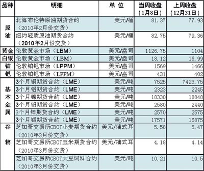 2010年第一周,國際大宗商品價(jià)格延續(xù)2009年最后一周上漲態(tài)勢。以油價(jià)和銅價(jià)漲勢最為明顯。 6日,美元對歐元、英鎊等主要貨幣匯率走低,抵消了美國原油商業(yè)庫存意外增加的影響,國際油價(jià)繼續(xù)上揚(yáng),紐約商品交易所一舉突破每桶83美元。截至當(dāng)日,國際油價(jià)已連續(xù)十個(gè)交易日上行,累計(jì)漲幅達(dá)14%,是1996年以來最長單邊上漲行情。 不過,美元對西方主要貨幣的比價(jià)7日上升,令以美元計(jì)價(jià)的原油期貨承壓,紐約、倫敦兩地油價(jià)當(dāng)天雙雙回落。截至8日收盤時(shí),紐約商品交易所2月份交貨的輕質(zhì)原油期貨價(jià)格,收于每桶82.75美元;倫敦北海布倫特原油期貨價(jià)格下跌38美分,收于每桶81.37美元。另外,雖然美國寒冷天氣仍在繼續(xù),但最新出臺的燃油商業(yè)庫存報(bào)告顯示各種油品供應(yīng)充足,原油庫存意外大幅上升,也使得油價(jià)缺乏上漲動力! 當(dāng)周國際金價(jià)持續(xù)上漲,倫敦黃金市場價(jià)格當(dāng)周收盤價(jià)每盎司為1126.75美元,受印度央行大舉采購黃金和圣誕節(jié)、春節(jié)到來拉動消費(fèi)的影響,國際金價(jià)出現(xiàn)快速上漲。 受智利銅礦工人罷工事件的影響,倫敦金屬交易所(LME)3個(gè)月期銅價(jià)格在周四(7日)一度飆升至7796美元/噸,這是自2008年8月以來最高水平。隨著全球經(jīng)濟(jì)回暖和中國銅需求的增加,銅價(jià)自2009年年初以來漲幅超過130%。 6日,紐約原油價(jià)格大幅走高,為玉米、小麥的上漲提供了利好的外部市場基調(diào)。分析人士稱,有關(guān)商品基金將調(diào)整持倉頭寸的預(yù)期推動小麥價(jià)格上漲。美國商品期貨交易委員會持倉報(bào)告顯示,此前投機(jī)性基金持有大量小麥凈空頭頭寸。 在美國大豆收割結(jié)束后,南美大豆生長狀況成為市場關(guān)注的重點(diǎn)。氣象預(yù)報(bào)顯示,近期巴西、阿根廷的天氣有利于大豆生長,從而為芝加哥期貨交易所(CBOT)大豆價(jià)格走勢帶來壓力。