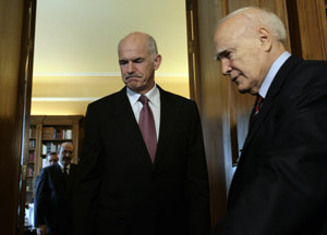 希臘總理向總統(tǒng)匯報(bào)即將采取的新的緊縮政策。3月3日,希臘總理喬治·帕潘德里歐(左)向總統(tǒng)帕普利亞斯匯報(bào)新的政策情況。