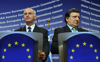 3月17日,在比利時首都布魯塞爾的歐盟總部,歐盟委員會主席巴羅佐(右)與到訪的希臘總理喬治·帕潘德里歐出席記者招待會。新華社記者