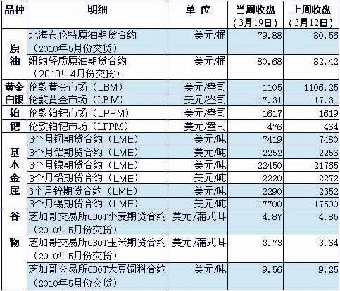 受當(dāng)周晚些時(shí)候美元匯率上升以及印度央行宣布加息的影響,倫敦市場(chǎng)金價(jià)小幅下跌。印度央行19日意外宣布加息以穩(wěn)定通脹預(yù)期,消息引發(fā)了投資者關(guān)于利率上升將削弱對(duì)包括貴金屬在內(nèi)的原材料需求的擔(dān)憂,加之印度是全球黃金消費(fèi)量最大的市場(chǎng)之一,因此引發(fā)黃金市場(chǎng)的拋售操作,推動(dòng)金價(jià)走低。 當(dāng)周國(guó)際油價(jià)圍繞每桶80美元關(guān)口波幅震蕩。受美元匯率走強(qiáng)等因素影響,國(guó)際油價(jià)15日全面回落,紐約油價(jià)跌至每桶80美元之下。此后的兩個(gè)交易日,受美元走軟、美聯(lián)儲(chǔ)繼續(xù)維持低利率政策和美國(guó)能源消費(fèi)需求回升等因素影響,國(guó)際油價(jià)接連上揚(yáng),17日紐約油價(jià)收盤時(shí)逼近每桶83美元。18日至19日,受美元對(duì)歐元匯率走強(qiáng)以及印度突然加息等因素影響,國(guó)際油價(jià)再度回落,紐約油價(jià)盤中跌破每桶80美元。 分析人士指出,當(dāng)周影響國(guó)際油價(jià)走勢(shì)的關(guān)鍵因素是美元匯率。由于在希臘債務(wù)危機(jī)問(wèn)題上歐盟內(nèi)部意見(jiàn)不一,希臘表示可能尋求國(guó)際貨幣基金組織的幫助,導(dǎo)致美元對(duì)歐元匯率走強(qiáng),以美元計(jì)價(jià)的能源商品價(jià)格因此普遍回落。而美聯(lián)儲(chǔ)16日決定維持超低利率政策的消息,不僅導(dǎo)致16日至17日美元走軟,也刺激了市場(chǎng)的風(fēng)險(xiǎn)偏好(低利率條件下,投資者為獲得高回報(bào)會(huì)將更多資金投入原油期貨市場(chǎng)),為油價(jià)提供上行動(dòng)力。 除錫價(jià)略有上漲外,倫敦市場(chǎng)基本金屬價(jià)格全線走低。 以銅價(jià)為例,由于投資者擔(dān)心,中國(guó)這一全球最大銅消費(fèi)國(guó)可能收緊貨幣政策,以抑制經(jīng)濟(jì)過(guò)熱,這種憂慮令市場(chǎng)人氣受壓;加之全球最大的銅生產(chǎn)國(guó)——智利的主要銅礦在近幾周生產(chǎn)受擾后,日前已恢復(fù)生產(chǎn),這些都拖累銅價(jià)下滑。 芝加哥期貨交易所谷物期貨價(jià)全線上漲。由于美國(guó)北部大平原地區(qū)日前遭遇洪水,愛(ài)荷華、南達(dá)科他和北達(dá)科他幾個(gè)州的玉米和大豆播種面臨威脅,二者的期貨價(jià)格因此快速走強(qiáng)。此外,由于非商業(yè)性的投機(jī)資金持有大量?jī)艨疹^寸,投機(jī)商的空頭回補(bǔ)獲利繼續(xù)推動(dòng)小麥反彈。