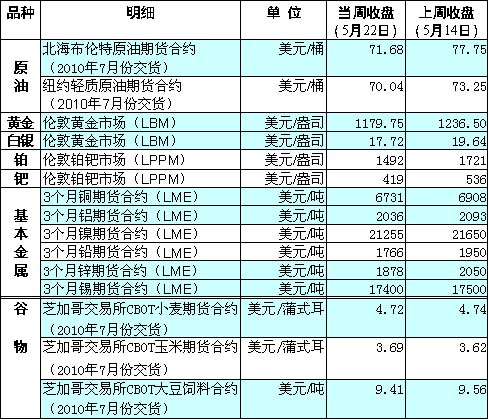 受歐元區(qū)債務(wù)問題以及美國(guó)經(jīng)濟(jì)數(shù)據(jù)等因素影響,國(guó)際油價(jià)延續(xù)下跌態(tài)勢(shì),周中一度跌至9個(gè)月來低點(diǎn)。 由于投資者擔(dān)心歐元區(qū)債務(wù)問題影響全球經(jīng)濟(jì)復(fù)蘇以及能源需求,加之美國(guó)原油庫存居高不下等因素,國(guó)際油價(jià)近期缺乏上漲動(dòng)力。數(shù)據(jù)顯示,美國(guó)商業(yè)原油庫存在過去16周中有15周出現(xiàn)上漲,紐約商品交易所原油期貨的交割地——俄克拉荷馬州的原油庫存量也處于歷史高位。周中紐約匯市歐元對(duì)美元匯率下探1比1.2160水平,跌至四年來新低,直逼歐元啟動(dòng)時(shí)的匯率水平,受此影響,紐約市場(chǎng)油價(jià)一度跌至每桶64.24美元,創(chuàng)下去年7月底以來的最低價(jià)。后在歐元對(duì)美元匯率反彈的帶動(dòng)下,油價(jià)有所回升。 當(dāng)周以黃金為代表的貴金屬因避險(xiǎn)吸引力被美元走強(qiáng)所弱化,各品種期價(jià)大跌。上周屢創(chuàng)新高、一枝獨(dú)秀的黃金成為在其他市場(chǎng)上損失嚴(yán)重的投資者鎖定利潤(rùn)的主要對(duì)象,黃金期價(jià)自18日以來連續(xù)4個(gè)交易日下跌,本周黃金期價(jià)下跌56美元,跌幅達(dá)到4.5%,盤中跌至兩周以來低點(diǎn)。21日,德國(guó)聯(lián)邦議會(huì)批準(zhǔn)歐盟與國(guó)際貨幣基金組織總額7500億歐元的救助機(jī)制,德國(guó)將對(duì)其中的1480億歐元信貸提供擔(dān)保,這在一定程度上緩和了投資者對(duì)歐洲主權(quán)債務(wù)問題的憂慮,推動(dòng)歐元兌美元匯率反彈,弱化了黃金的避險(xiǎn)吸引力。 農(nóng)產(chǎn)品方現(xiàn),各主要品種表現(xiàn)比較抗跌。受中國(guó)或?qū)⑦M(jìn)口更多美國(guó)農(nóng)產(chǎn)品的市場(chǎng)傳言以及天氣因素的綜合影響,使玉米成為本周收盤價(jià)走高的“稀有”品種。但是天氣預(yù)報(bào)顯示,美國(guó)中部地區(qū)有望持續(xù)11至15天的溫暖干燥天氣將保證玉米播種的順利完成。因此,天氣因素總體仍對(duì)玉米期價(jià)后市構(gòu)成利空。