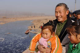 12月9日,在“引黃濟(jì)淀”黃河水入淀現(xiàn)場(chǎng),任丘市大樹(shù)留莊村民李玉山帶著孫女觀看黃河水入淀。